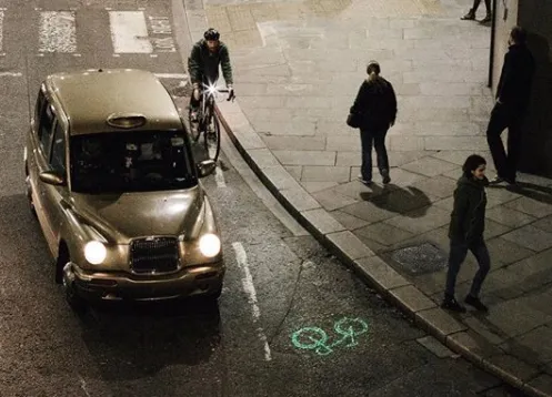 Das Apple-Gerät im Bereich der Fahrradlampen: Diamantgeschliffener Aluminiumklotz, eingebauter Akku, wasserdicht, 300 Lumen Leuchtkraft, Magsafe-Ladekabel und die eine Sache, wegen der ich es mir gekauft habe: Es projiziert ein kleines grünes Fahrrad mehrere Meter vor einem auf die Straße. Die Sichtbarkeit gegenüber dem Verkehr soll in einem solchen Maße besser sein, dass die knapp 12.000 Santander-Leihräder in London alle damit ausgestattet ↗ werden. Klingt nach einer guten Investition, mit der ich jetzt fünf Wochen lang durch Berlin gefahren bin.