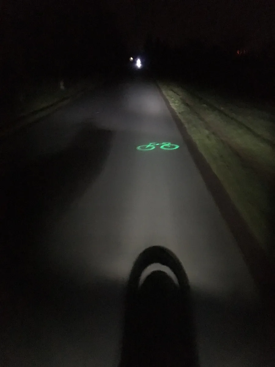 Gravierender ist allerdings, dass das Licht (nicht der Laser) stark blendet und offenbar nicht mit einer harten, blendfreien Kante abgeschnitten wird. Das Licht ist ein breiter, hoher Kreis, der kaum weiter leuchtet als eine günstige BUMM, dafür aber deutlich blendet: Wer das grüne Fahrrad 6 Meter vor sich auf dem Boden wirft blendet die ihn entgegen kommenden tonnenschweren Autos. Es mag jeder überlegen, wie sinnvoll das für die eigene Sicherheit ist. Erst als ich das Licht so ausrichtete, dass es sich 1,5 Meter vor dem Vorderreifen befand, wurde ich bei Autofahrerkopfhöhe nicht mehr geblendet, damit wird allerdings der Laser unnütz. Als normale Beleuchtung ist das Blaze Laserlight damit nicht sicher und auch nicht sinnvoll verwendbar.