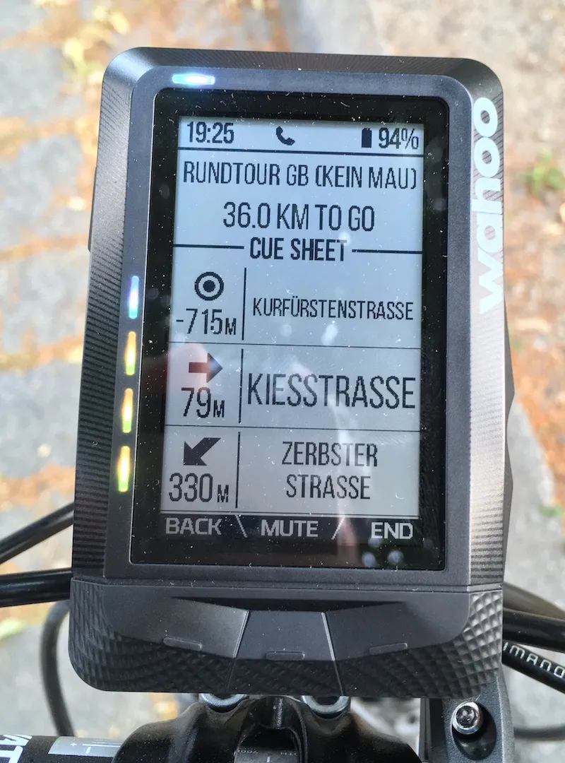 Neben der Navigation können die drei LED-Leisten noch Informationen über die Leistung ausgeben, wie die Herzfrequenz (bei entsprechendem Sensor) oder die Geschwindigkeit. Letztere habe ich aktiviert und sehe links neben die Bildschirm, ob ich schneller oder langsamer fahre als die bisherige Durchschnittsgeschwindigkeit. Lustigerweise ist das eine deutlich bessere Motivation als alles, was mein Fitnessarmband mir bieten konnte.